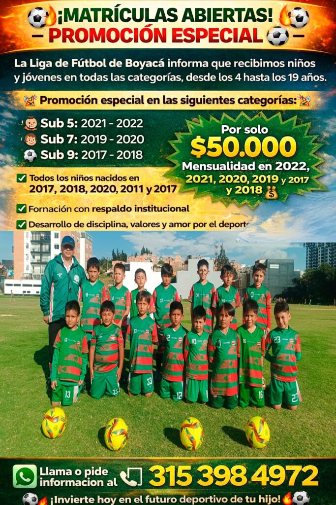 Escuelas de Formación. La Liga de Fútbol de Boyacá los invita a hacer parte de sus procesos de formación para niños entre los 4 años a 19 años. Ven y entrena dentro de la ciudad de Tunja. El costo de la matrícula es de 40 mil y La mensualidad 45 mil. Es decir