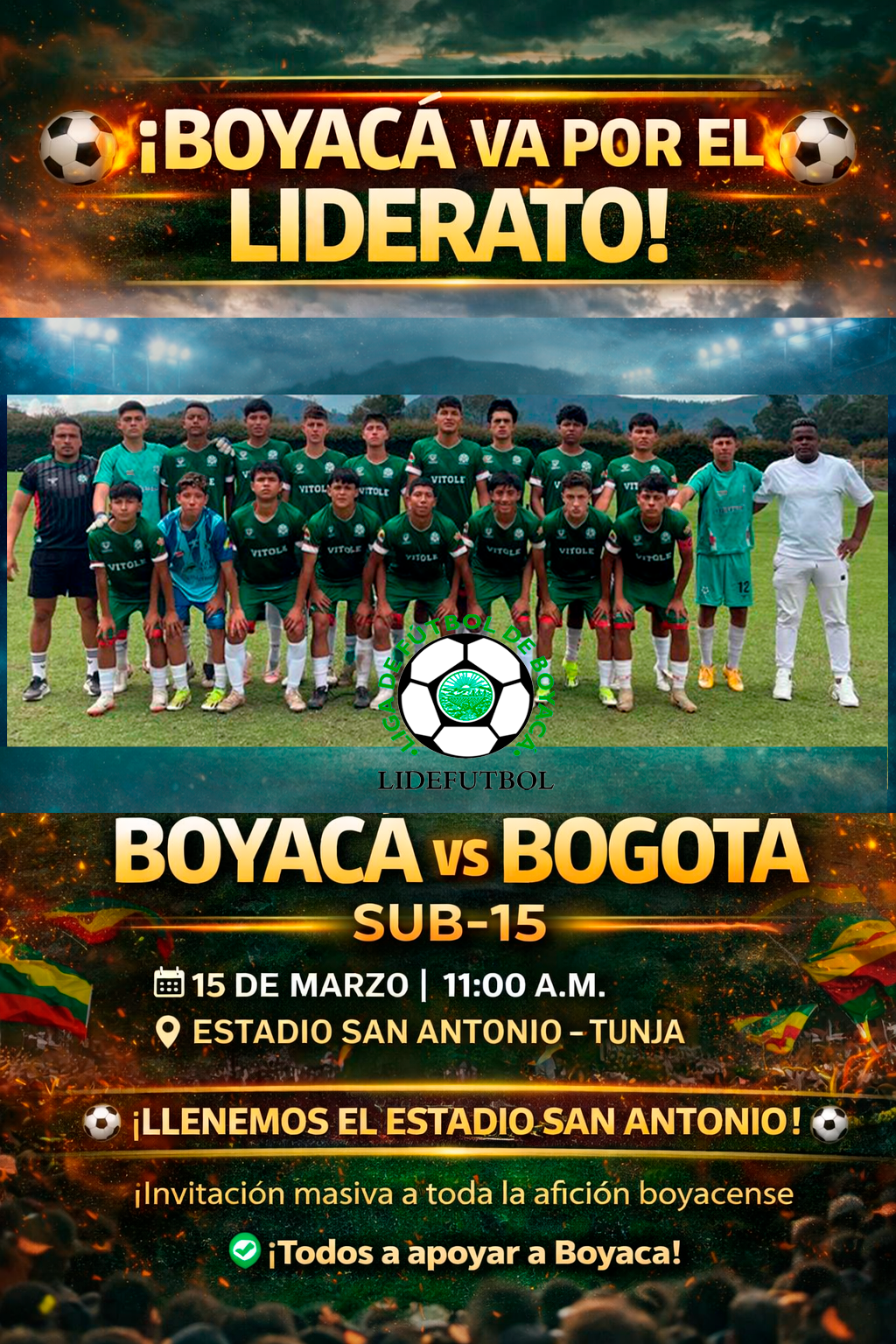 Enfrentará hoy a su similar de la Liga de Fútbol de Bogotá en compromiso correspondiente a la segunda fecha del Campeonato Nacional Interligas Sub-15. El encuentro se disputará en el Estadio San Antonio de Tunja, donde el combinado boyacense buscará hacerse fuerte en casa y sumar puntos importantes en el grupo frente a uno de los rivales más exigentes del torneo.